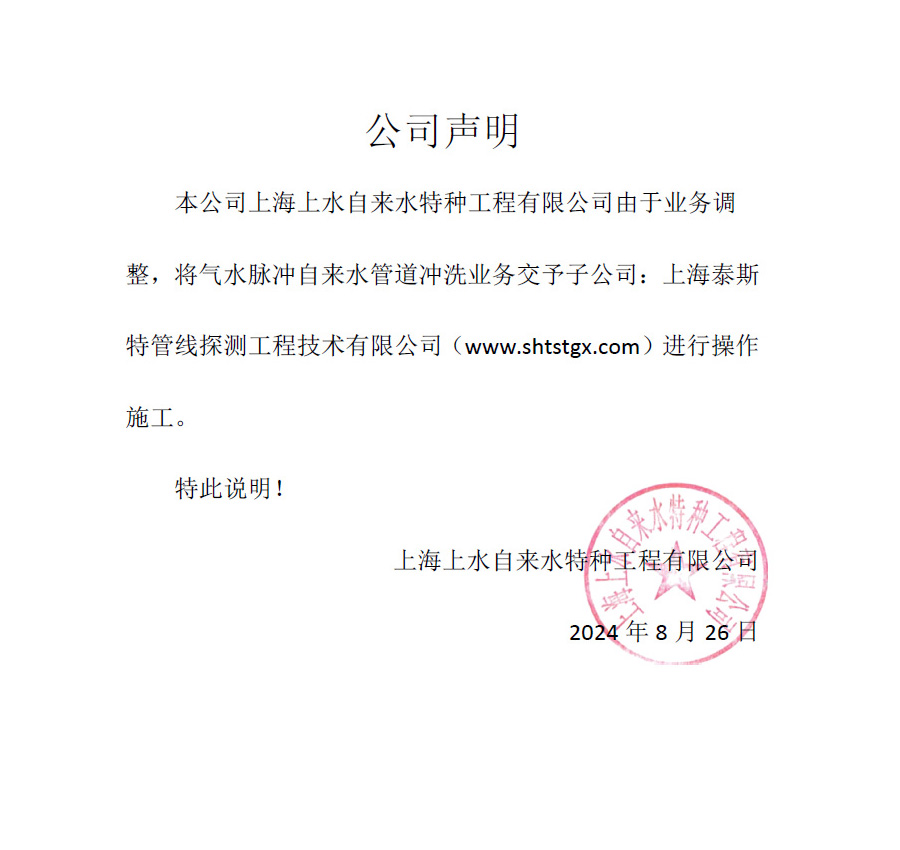 特别通知:上海上水自来水工程有限公司(上水特种)由于业务调整,将气水脉冲水特种工管道冲洗业务交予子公司:上海泰斯特管线探测工程技术有限公司(www.shtstgx.com)进行推广施工。
