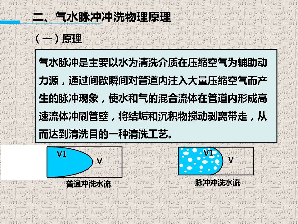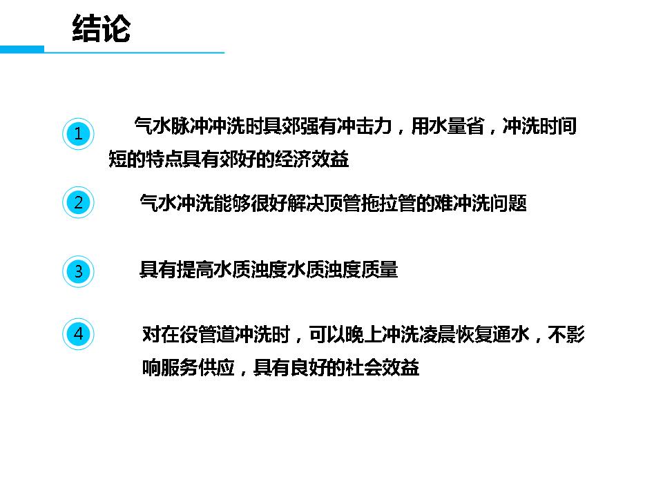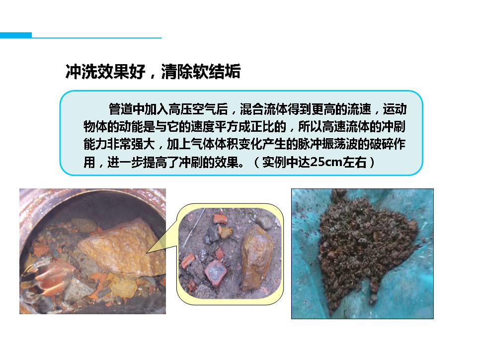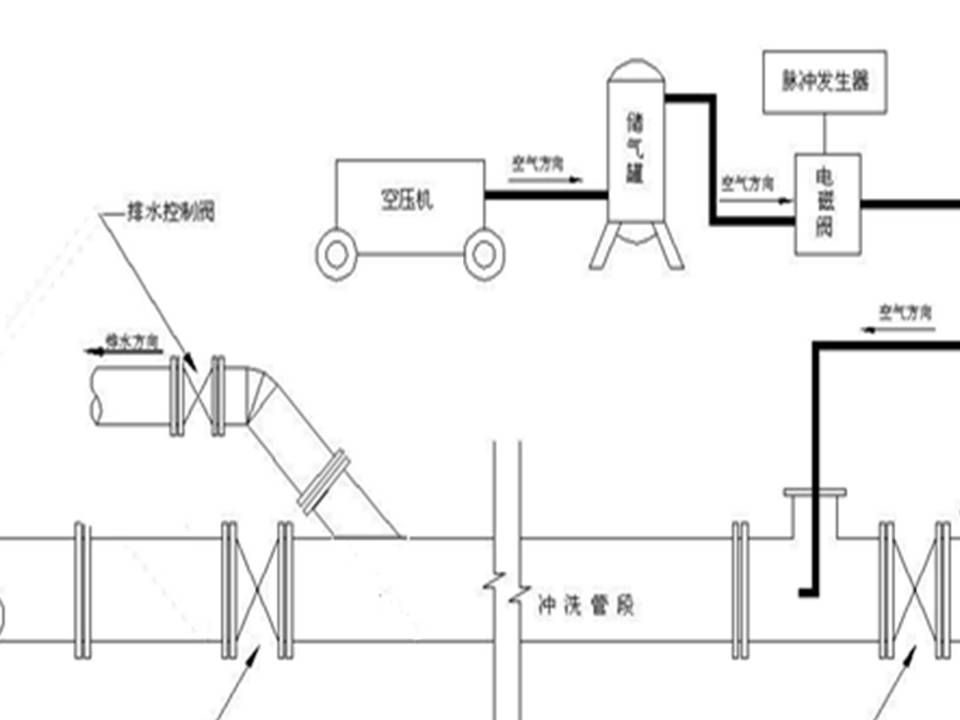 自来水在圆形管道中有层流和紊流两种流态,城市供水管网中的水流一般都处于紊流状态。气水脉冲清洗水管道是利用空气的可压缩性,在管内形成间断的气水流,随着空气的压缩和扩张,使管内的紊流加剧,水流的切应力增大,管壁上的沉积物和附着物被冲下,并随着高速水气流排出。