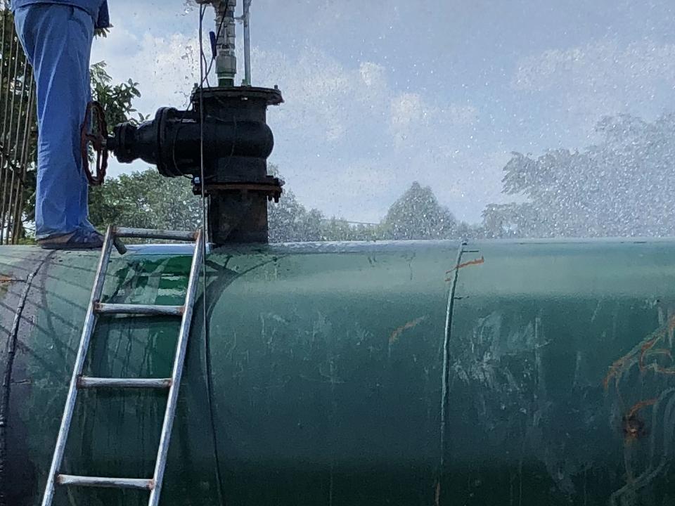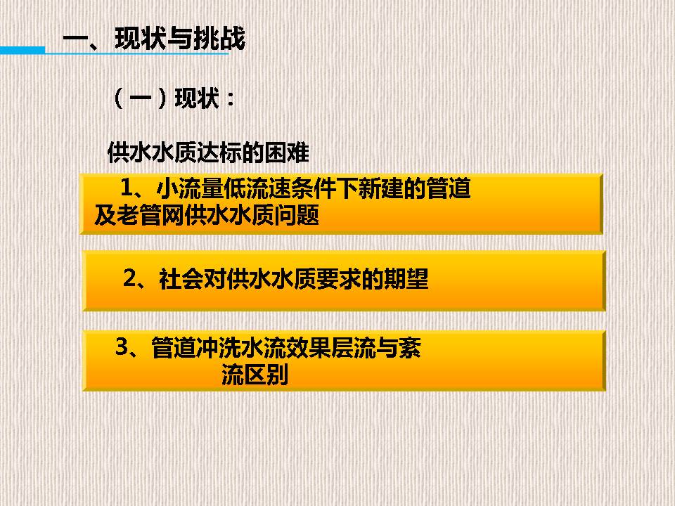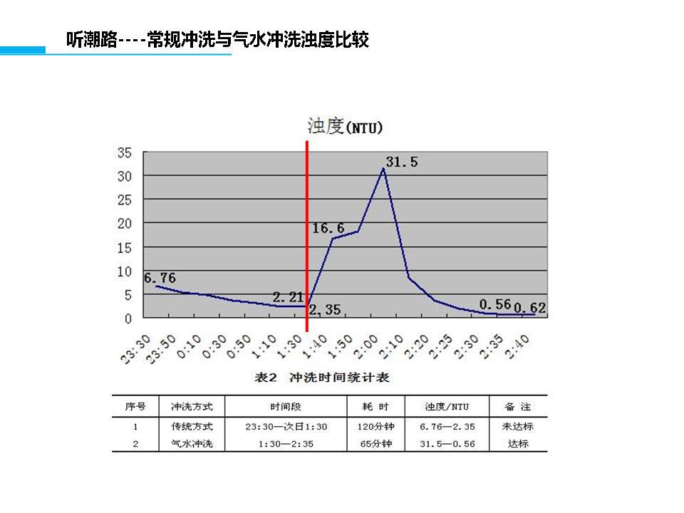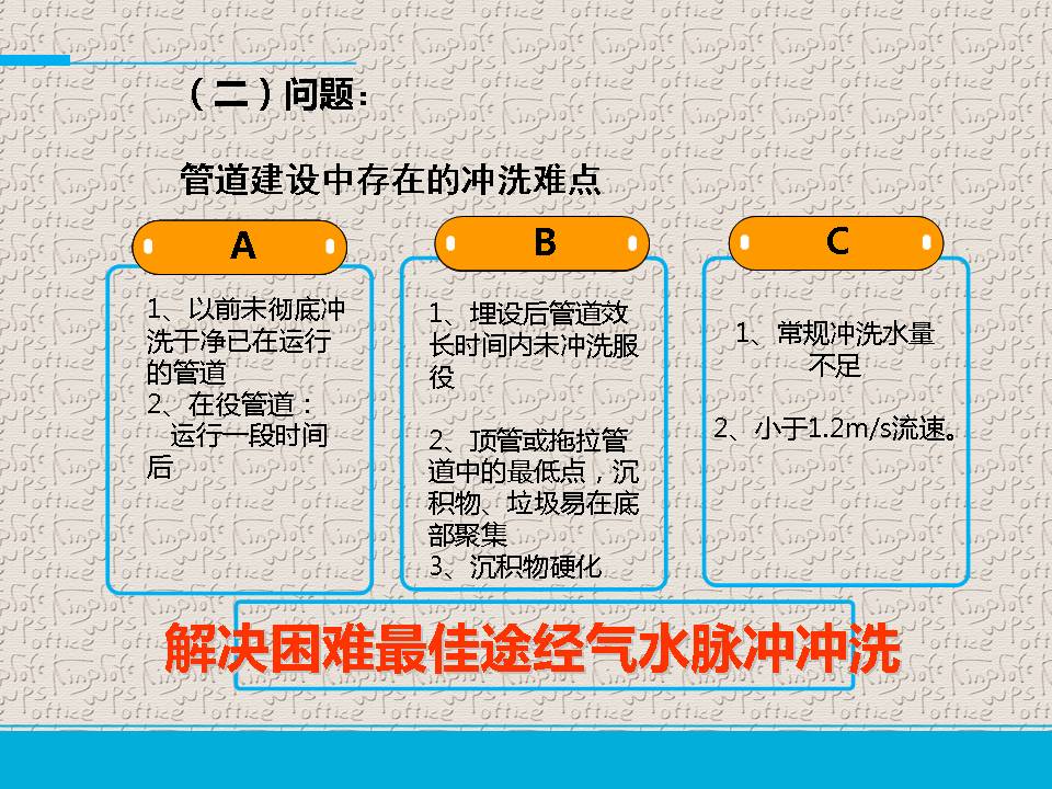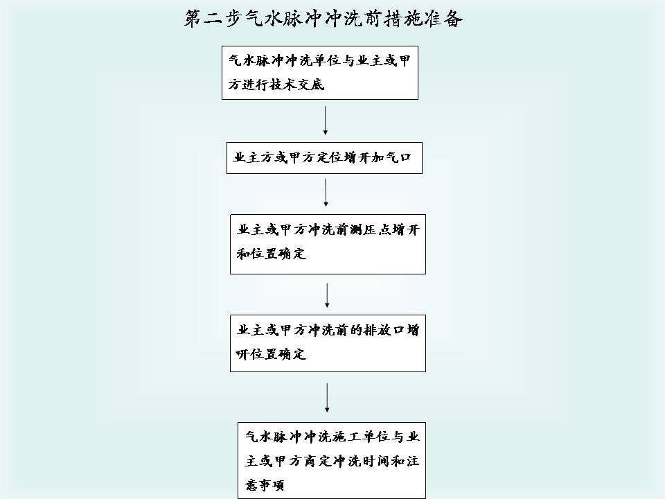 自来水在圆形管道中有层流和紊流两种流态,城市供水管网中的水流一般都处于紊流状态。气水脉冲清洗水管道是利用空气的可压缩性,在管内形成间断的气水流,随着空气的压缩和扩张,使管内的紊流加剧,水流的切应力增大,管壁上的沉积物和附着物被冲下,并随着高速水气流排出。