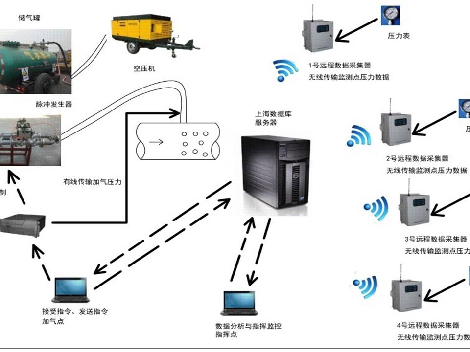 气水脉冲管道冲洗施工设备除了采用空压机、储气罐、脉冲控制器和脉冲加气机等硬件设备外,还采用了现场数据采集、数据远程传输和反馈、以及远程服务器监控和现场电脑操作控制等IT技术,使整个管道气水脉冲施工进行得有序和可控,从而保证了冲洗安全和冲洗质量。