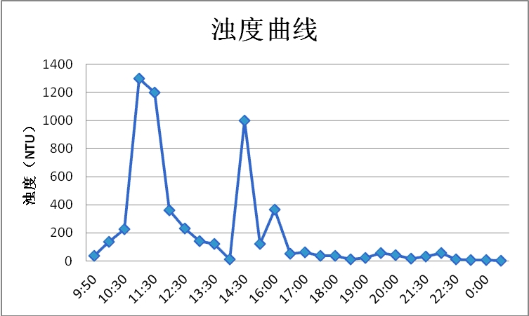 因上述无法取水样的原因,第三段冲排了8小时左右,然后第三段与第四段串联在一起冲洗,最终以二泐港桥排放口水样为准。第三段与第四段共加气量12902 m3,气水混合比2.15/1,流速大于1.11m/s,采样共23次,该串联冲洗段未出现水样反复现象,最高浊度128度持续半小时,从66.9度~40.7度持续3小时,40.7度~13.7度持续3小时, 13.7度~3.96度持续3小时,2.01度~0.8度持续1小时。